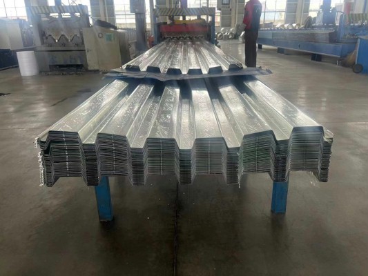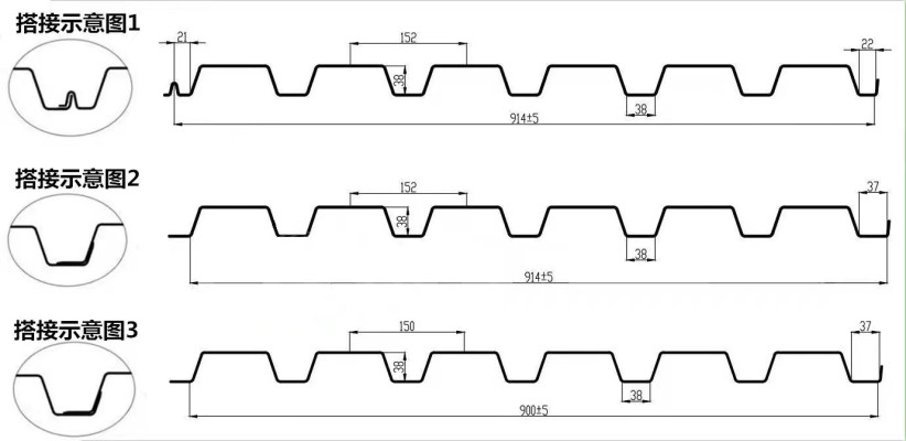 YX38-152-914开口压型钢板,它的肋高为38mm,由6个波组成,每个波距为152mm,整板宽度为914mm,它的展开宽度为1250mm,既可作为屋面底板/墙面板,也可作为楼层模板使用,施工非常便捷,完工后效果美观。